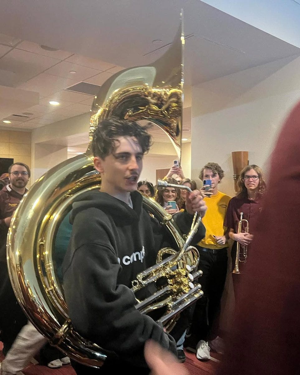 Discourse around the speech brought to light that he cares. Timothée wears on his sleeve that he gives a fuck. He showed up to his own lookalike contest in Washington Square Park. He posts videos of himself lipsyncing along to French songs. What finally won me over was seeing him kicking it with a high school band in Minnesota on a random weekday. It reminded me of my friends who are always on sidequests. ‘What the fuck are you doing in Minnesota?’