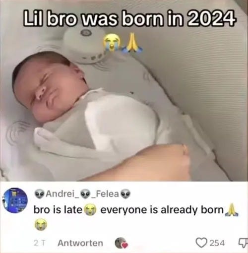 Maybe you’ve seen it. I think it was a Tiktok screenshot specifically— of a newborn overlaid with text reading something to the tune of “lil bro missed everything.”